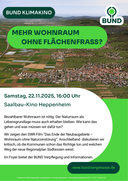Natürlicher Boden sichert unsere Ernährung, ist Lebensraum für Pflanzen und Tiere, sorgt für Kühlung, filtert und speichert Wasser und nimmt große Mengen CO2 aus der Atmosphäre auf. Gerade in Zeiten der Klimaerwärmung gehört Bodenschutz zu den gesetzlichen Pflichten der Kommunen. Andererseits ist die Nachfrage nach bezahlbarem Wohnraum ungebrochen hoch. Diese Problematik wird in der beim KlimaKino gezeigten SWR-Dokumentation “Das Ende der Neubaugebiete –Wohnraum ohne Naturzerstörung” deutlich, unter anderem am Beispiel der Stadt Weinheim. Der Film zeigt aber auch ermutigende Beispiele, wie im Inneren von Siedlungen Wohnraum geschaffen werden kann durch die Nutzung von Baulücken, Brachen und Leerständen – als Alternative zur Flächenversiegelung auf der grünen Wiese.